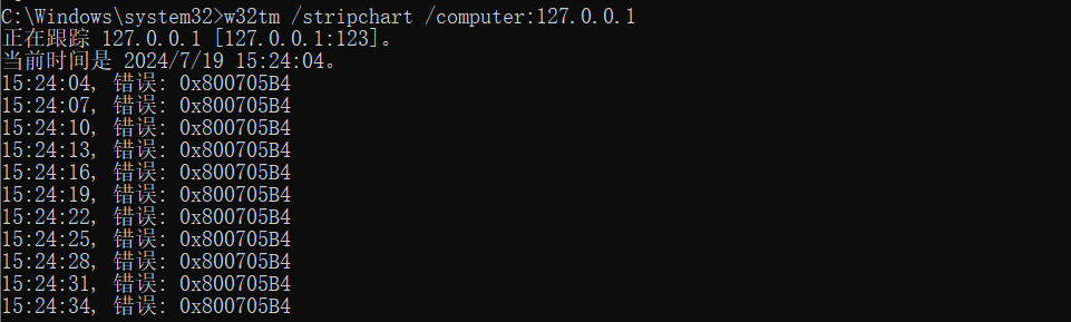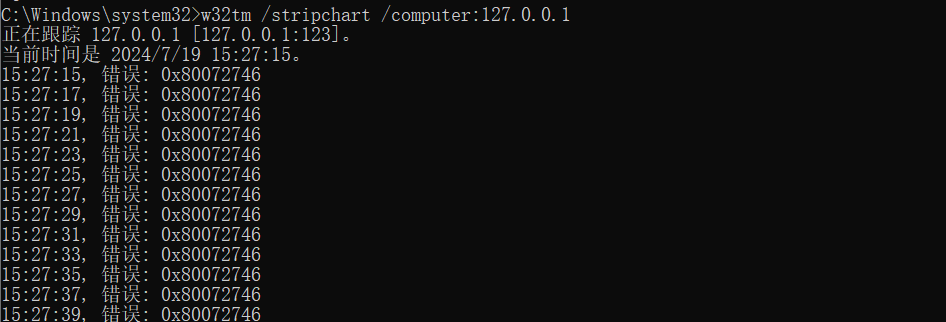 在cmd窗口中输入w32tm /stripchart /computer:127.0.0.1 ,如果有回显则服务正常。